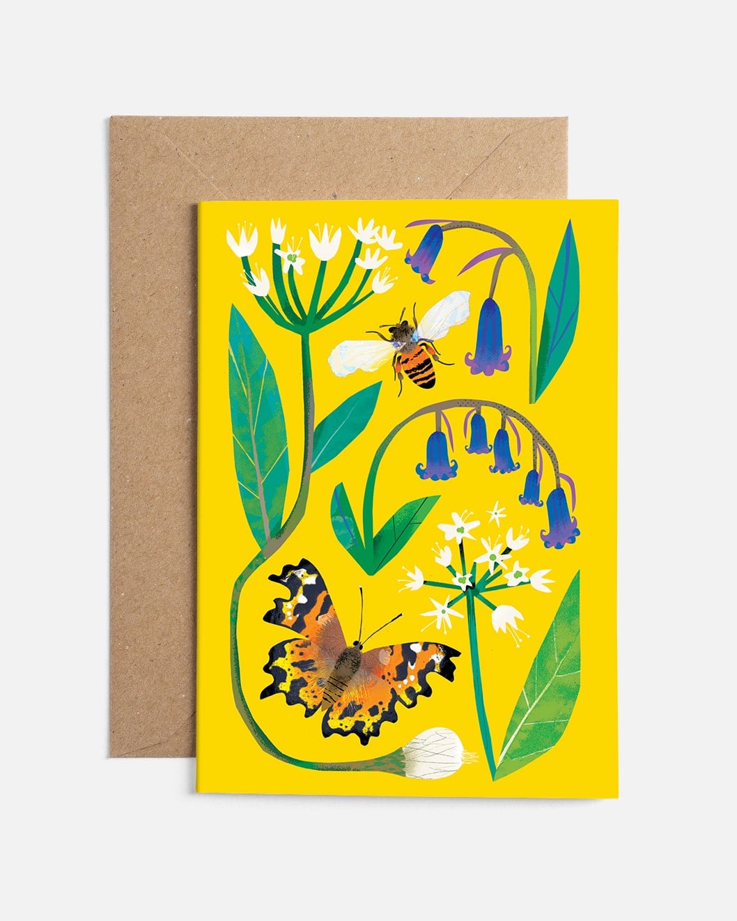 A sunny yellow greeting card showcasing the brilliance of British wildlife, including wild garlic, a red mason bee, a common bluebell, and a comma butterfly. Perfect for nature lovers.