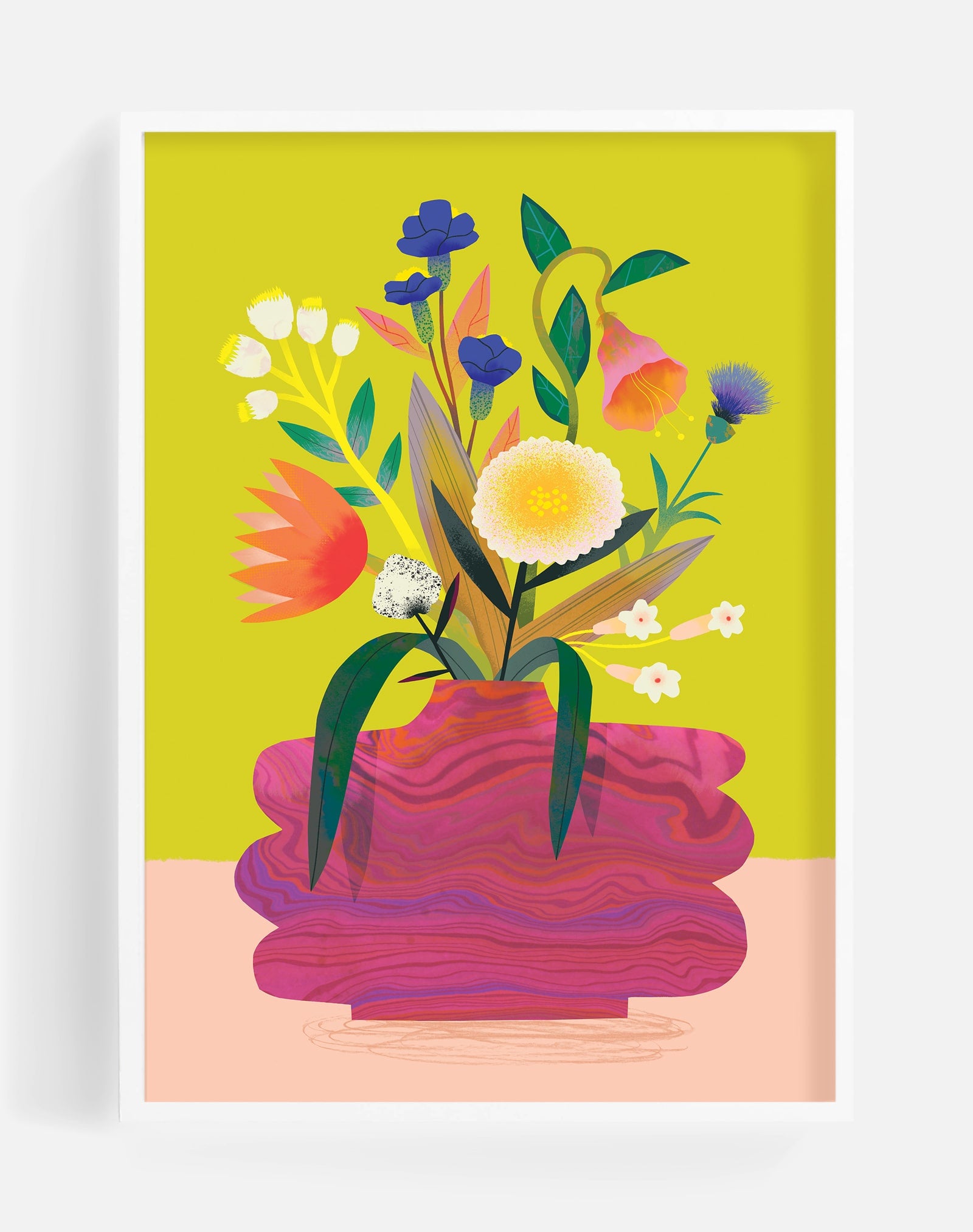 Infuse your home with this sunny exuberant print. Set against a zingy lime backdrop, the burst of vibrant flowers and marble effect vase will add colour to any wall. Ideal for the living room, bedroom, or office, this playful print is sure to brighten your day.