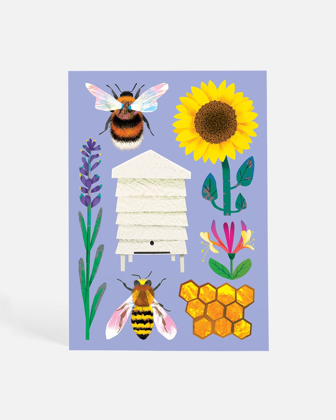 Showcasing the busy world of pollinators with the humble garden bumblebee, “Ballard” sunflower, “Imperial Gem” lavender, human-made WBC beehive, “Serotina” honeysuckle, honeybee, and a piece of honeycomb. This card captures the charm of British summer meadows. Perfect for bee and nature lovers.