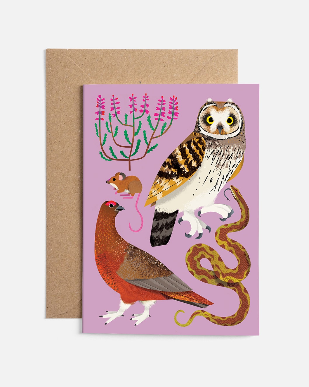 This A6 greeting card features a collection of species found in the UK's moorland and heathland. Ling Heather, a short-eared owl, a wood mouse, a red grouse, and a curious adder, all set within the delicate pinks and purples of the season.