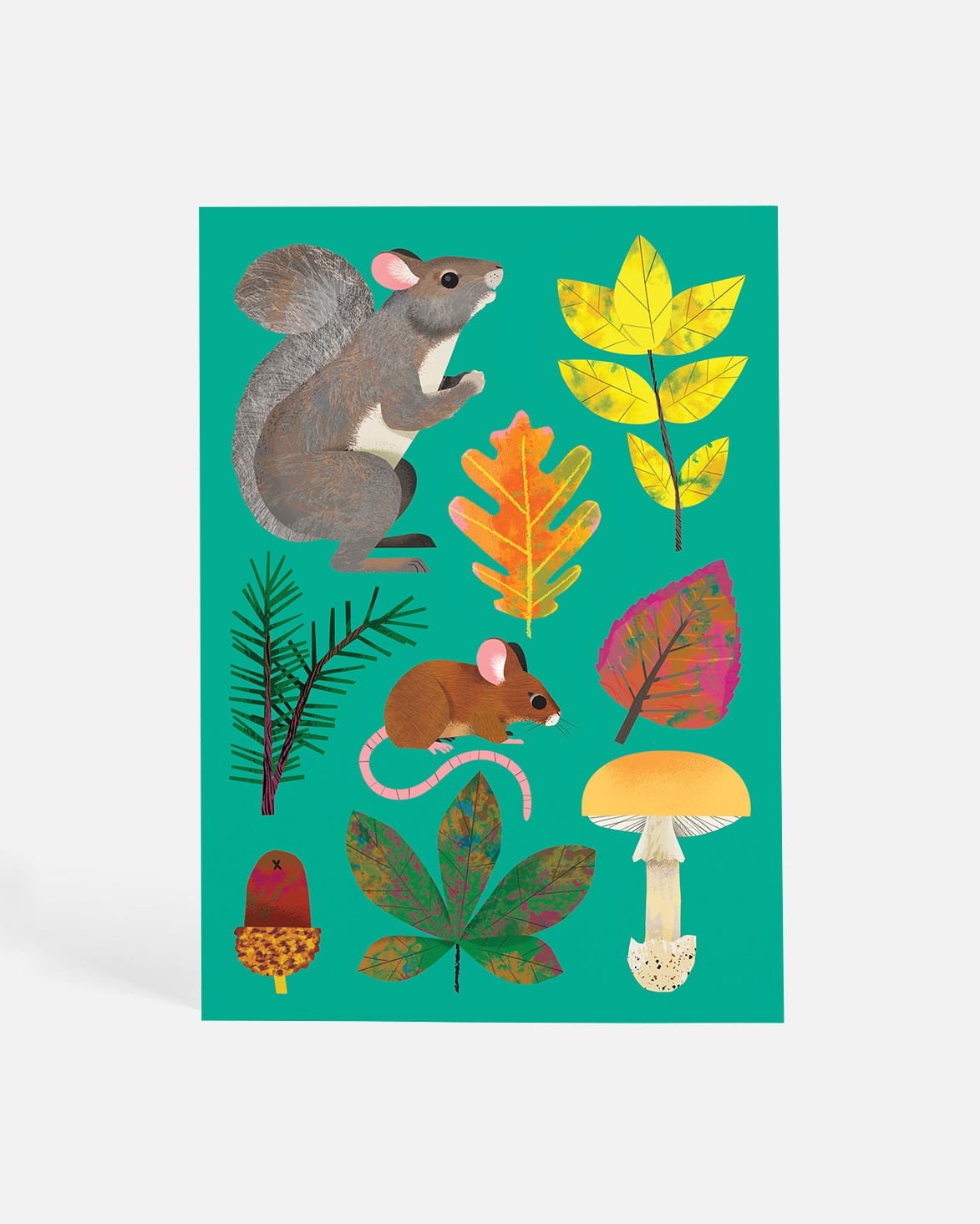 Showcasing nature’s bounty with Eastern grey squirrel, English oak leaf, common ash leaf, Douglas fir leaf, wood mouse, common beech leaf, acorn, horse chestnut leaf, and death cap mushroom, this card is great for nature lovers and thoughtful gifting.