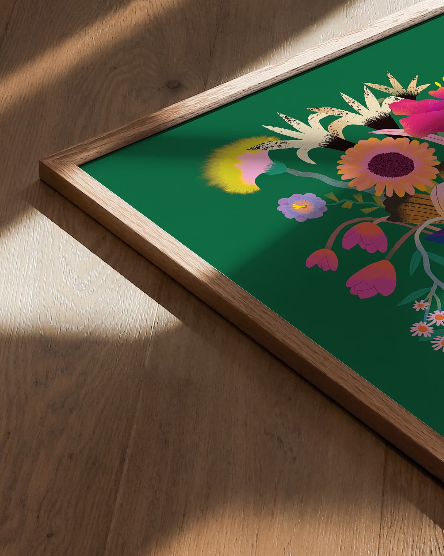 For the fellow colour lovers out there, say hello to Natasha's "Flower Bunch Green" print. Set against a deep green backdrop, a large marbled vase bursts with a celebration of all things botanical. Pops of magenta pink flowers and quirky paper-cut shapes create a lively yet sophisticated would piece.