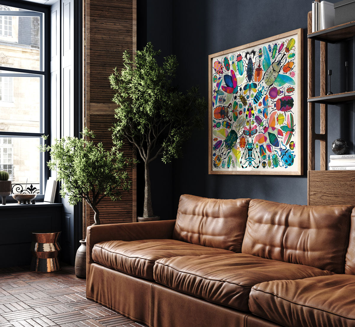 The beautiful world of insects inspired Natasha's most popular print. This kaleidoscopic illustration of 66 species features primarily beetles but also contains some stunning true bugs.