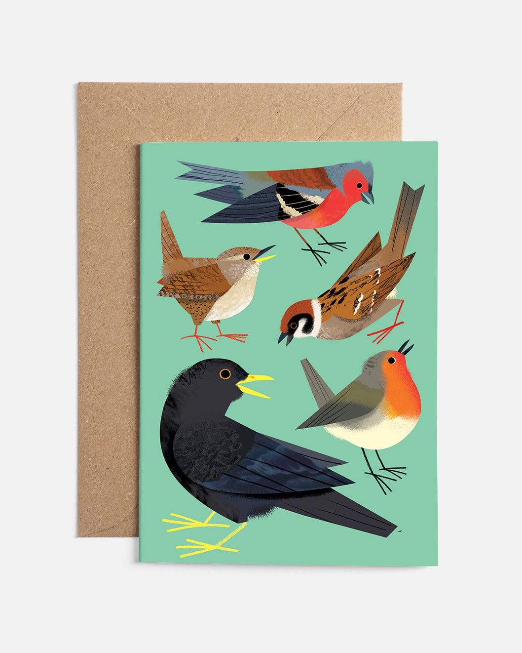 Tune into spring’s melody with this A6 greetings card, featuring songbirds such as the common chaffinch, European wren, European tree sparrow, common blackbird, and European robin. This one's for all you fellow bird lovers.