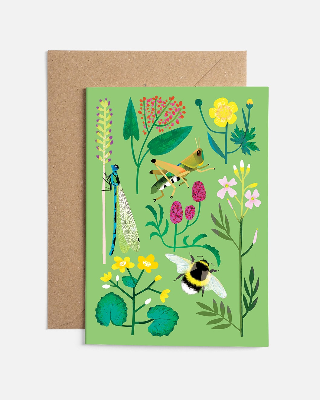 Celebrate summer’s wild beauty with this A6 greetings card, featuring species found in lowland meadow, like crested dog’s-tail, common sorrel, meadow buttercup, southern damselfly, meadow grasshopper, “Red thunder” great burnet, cuckooflower, marsh-marigold, and white-tailed bumblebee. Perfect for people who find joy in the beauty of the natural world.